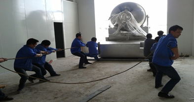 午飯后,大家顧不上休息。來(lái)自各個(gè)部門(mén)的十五六名青壯年,聚集在設(shè)備安裝現(xiàn)場(chǎng)。在郝康廠(chǎng)長(zhǎng)的帶領(lǐng)和指揮下,所有人一共分為三個(gè)小組。第一個(gè)小組負(fù)責(zé)在混合機(jī)下面鋪設(shè)鋼管,使二維混合機(jī)能始終在鋼管上滾動(dòng)。第二個(gè)小組在后面,負(fù)責(zé)推、撬動(dòng)混合機(jī)。第三個(gè)小組則在前面依靠纜繩使勁地拉動(dòng)混合機(jī)。在“一、二、三”的吶喊聲中,大家配合的很默契,二維混合機(jī)也朝著預(yù)定的方向蠕動(dòng)著。一兩個(gè)小時(shí)過(guò)去了,大家的聲音變得嘶啞了,衣服也都被汗水浸透了。值得欣慰的是,二維混合機(jī)最后以“倒車(chē)入庫(kù)”的方式準(zhǔn)確、安全地定位了。